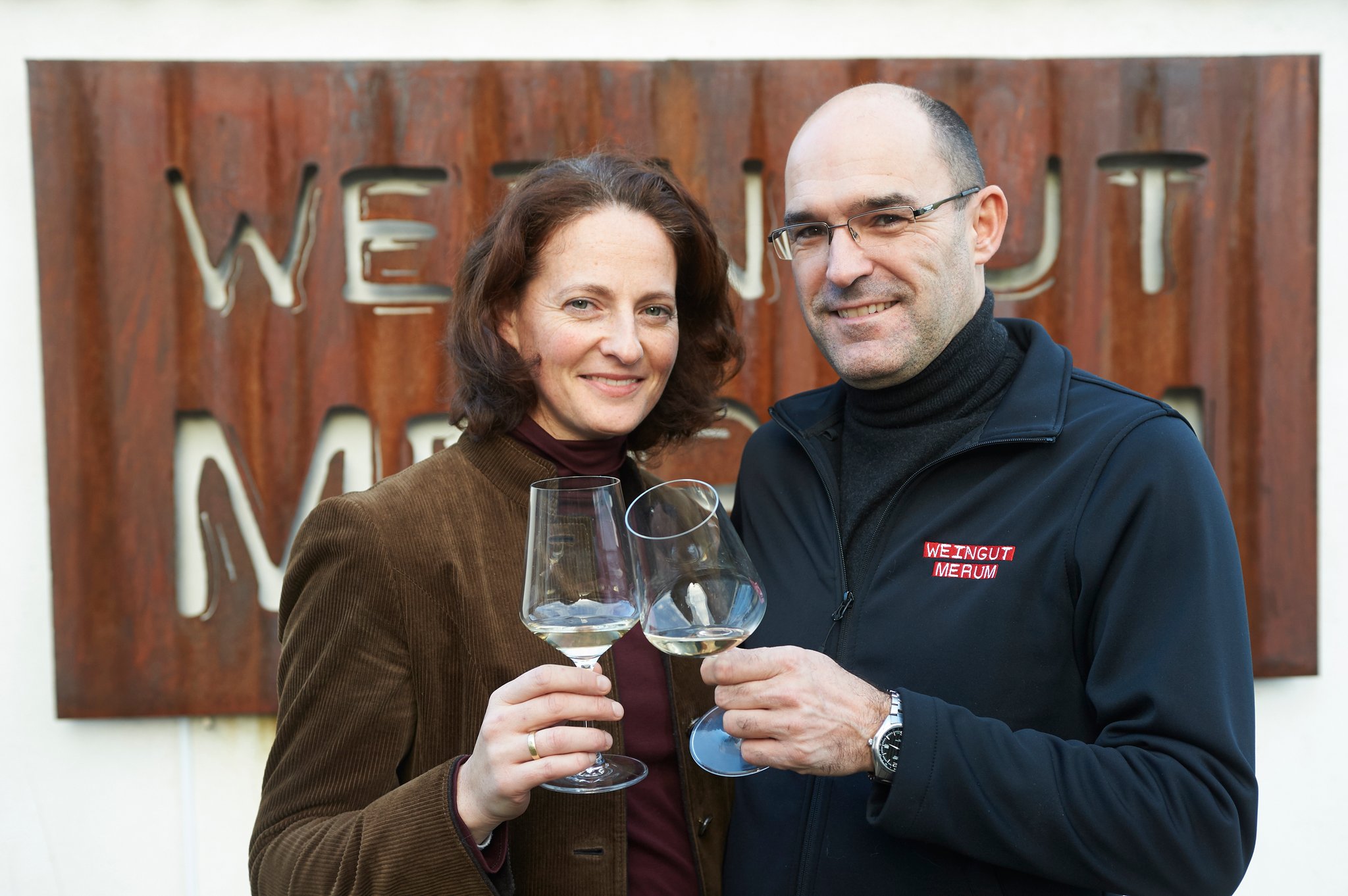 Eva-Maria und Heinz Wurzinger vor der Eisentafel "Weingut Merum" zu den Weintagen 2017